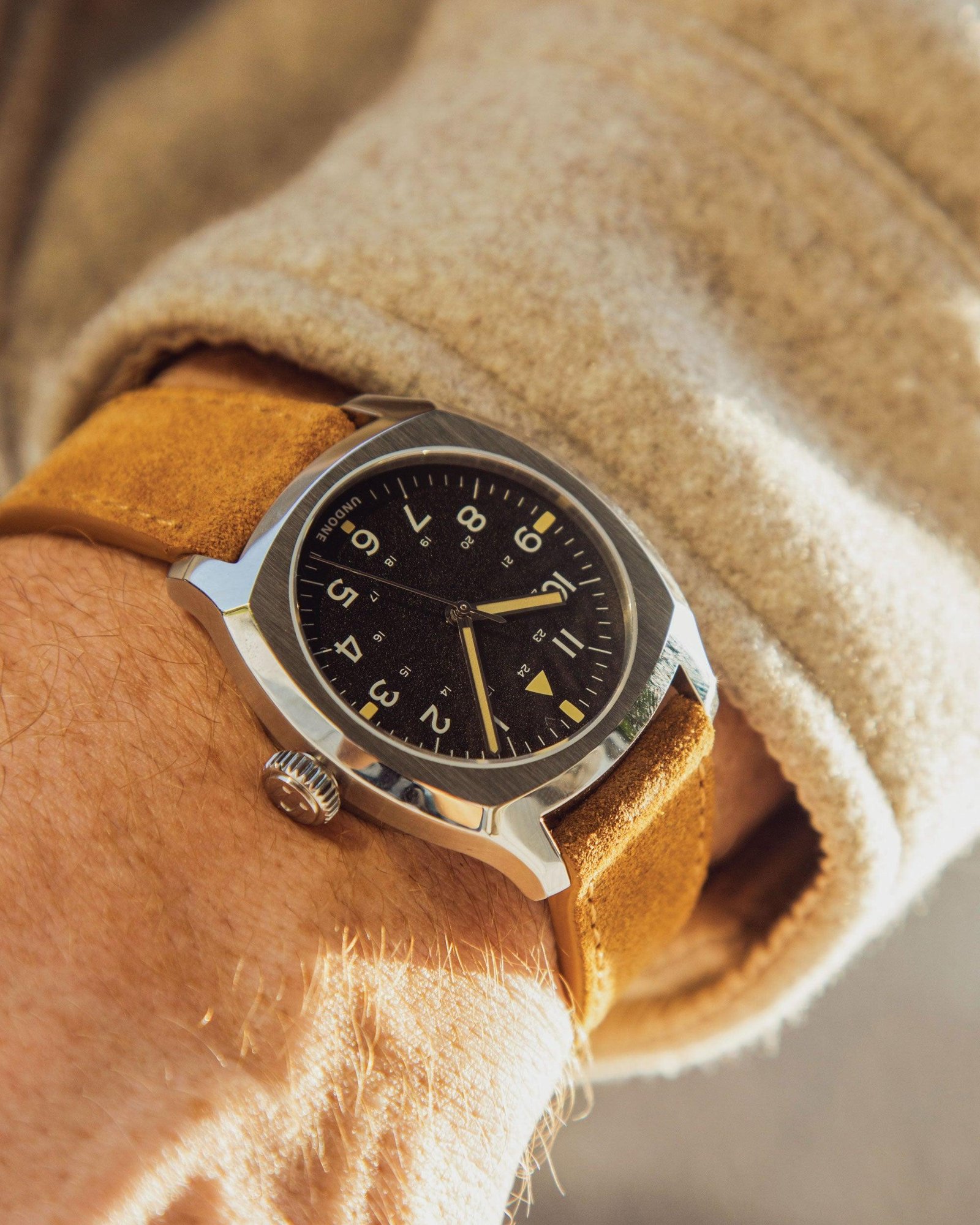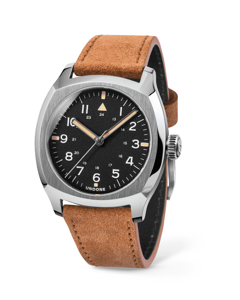 Designed for both modern men and women, the Terra Daybreak Suede sports a tartaruga (tortoise) shaped case, an UNDONE’s first, at just 37mm wide. The watch comes with a 2-colored lume – its 12-hour numbers illuminate in blue, while the thick indices markers, the iconic triangle (for easy identification) at 12 o’clock, and the hour & minute hands light up in green under low-light conditions. The Terra Daybreak Suede comes with a light brown suede strap.